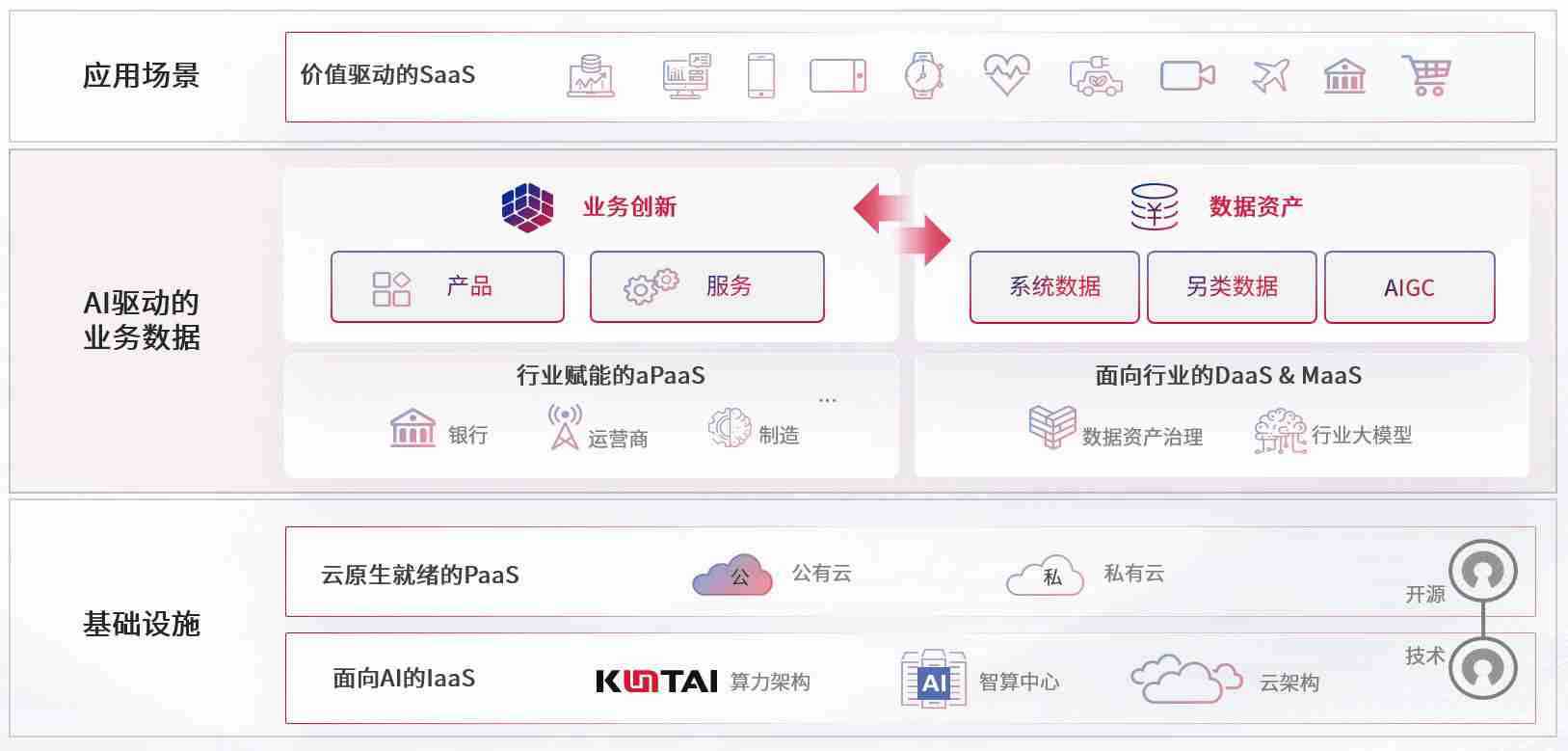 数字时代,,,,围绕企业数字化转型的关键要素,,,,糖心vlog数码开创性的提出数云融合战略和技术体系框架,,,,着力在云原生、、、数字原生、、、AI原生和信创产业上架构产品和服务能力,,,,为处在不同数字化转型阶段的快消零售、、汽车、、、金融、、医疗、、、、政企、、、、教育、、、运营商等行业客户提供泛在的敏捷IT能力和融合的数据驱动能力,,构建跨界融合创新的数字业务场景和新业务模式,,助力企业级客户建立面向未来的核心能力和竞争优势,,全面推动社会的数字化、、智能化转型升级。。