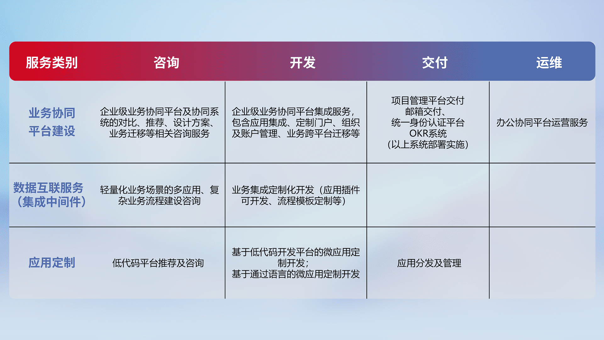 针对钉钉、、、、企微、、、、IDaas等平台级产品提供产品的规划、、、、方案、、、交付、、、、定制化开发等服务,,实现如统一协同办公、、、、智能客户服务、、混合会议管理、、、、智能数据查询、、等业务场景,,,,实现数字化转型。。